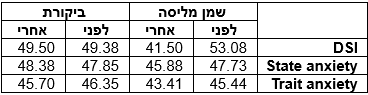 בהשוואה לערכי הבסיס, בקבוצת ההתערבות נצפה שיפור מובהק בכל שלושת המדדים שנבדקו, בעוד שבקבוצת הביקורת נצפה שיפור מובהק רק במדד החרדה המצבית.